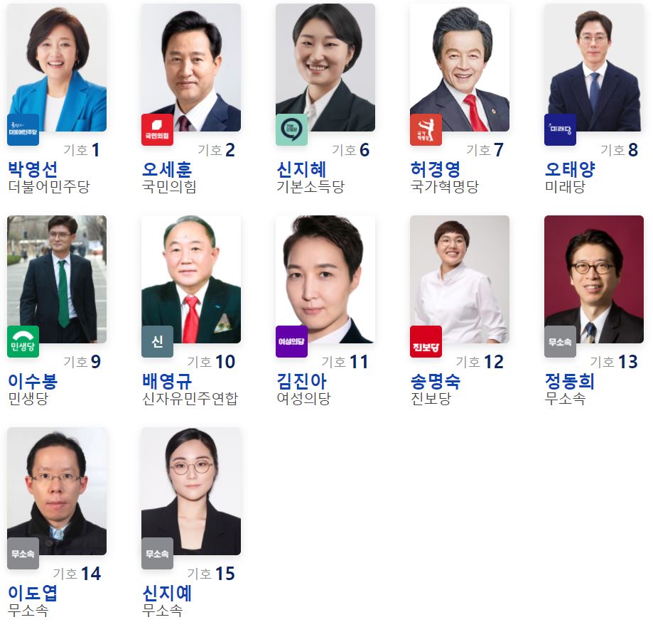 박영선(더불어민주당), 오세훈(국민의힘), 신지혜(기본소득당), 허경영(국가혁명당), 오태양(미래당), 이수봉(민생당), 배영규(신자유민주연합), 김진아(여성의당), 송명숙(진보당), 정동희(무소속), 이도엽(무소속), 신지예(무소속)