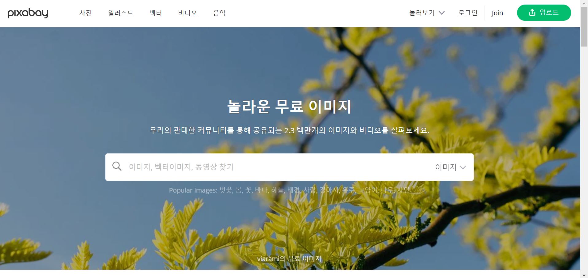 대표적인 무료 이미지 다운로드 사이트이다. 한글 검색을 지원하며 2백만개 이상의 이미지와 비디오 소스를 가지고 있다. 다양한 사이즈의 선택지가 마련되어 있어서 원하는 크기의 사진 소스를 쉽게 다운받을 수 있다. 원하는 단어를 검색하면 무료 이미지가 많이 나오는데, 사이트 상단 부분에 스폰서 이미지도 수록되어 있으니 사용에 유의하는 것이 좋다. 유료 이미지를 구매할 때 pixabay20 쿠폰을 이용하면 20% 할인을 받을 수 있다.