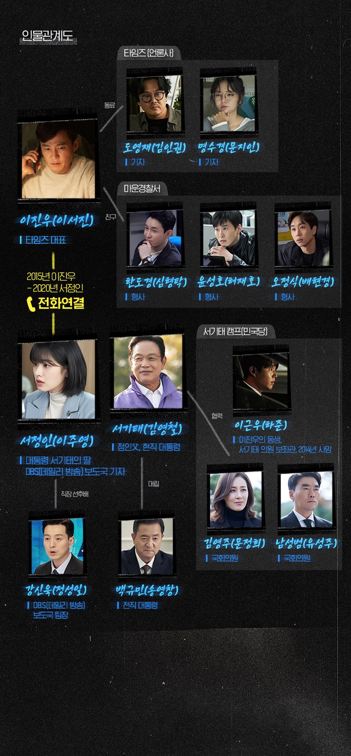 -이진우(이서진) : 진실을 좇는 소신파 기자이자 타임즈 대표이다. 타임즈는 2015년의 영세 언론사이다. 가감 없이 써대는 신랄한 기사로 높은 사람들의 심기를 거스르는 것이 특기인 인물이다.