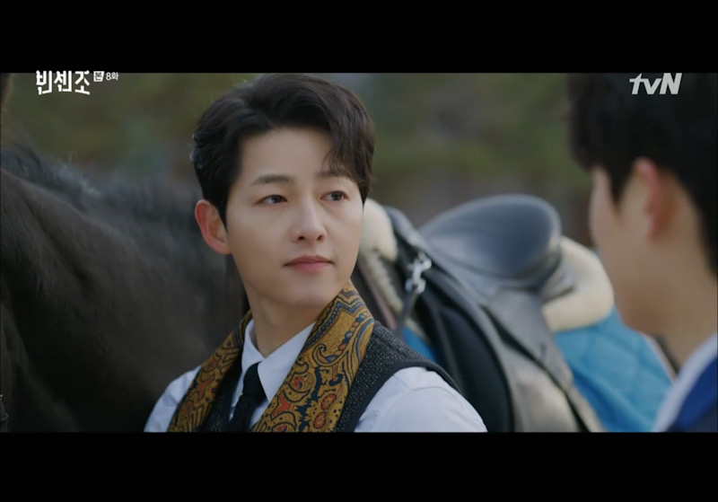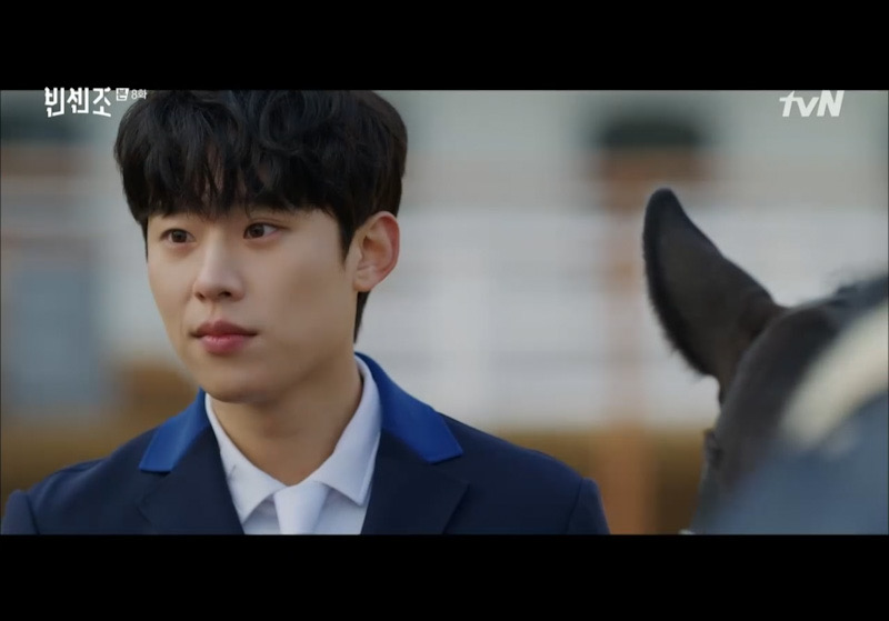 빈센조는 황민성이 자주 시간을 보낸다는 승마장에 가서 그를 유혹한다. ㅋㅋㅋㅋㅋㅋㅋㅋㅋ 그 과정에서 한민성은 빈센조에게 자기 아버지 사건의 진실을 술술 말한다. 오경자는 모든 죄를 뒤집어쓰고 깜빵에 간 것이었다. 이에 극도로 화가난 빈센조는 민성에게 주말에 만나자고 한다.
